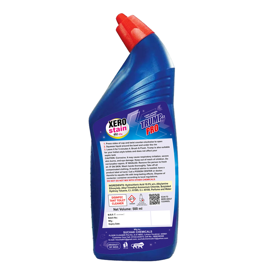 Trump Pro Toilet Cleaner – 500 ml is formulated to remove tough stains, lime scale, and germs from toilets effectively. It leaves your washroom hygienic, sparkling clean, and refreshed with every use, ensuring a healthier and odor-free environment.